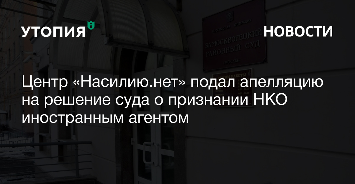 Центр «Насилию.нет»* подал апелляцию на решение Замоскворецкого суда об отказе в удовлетворении иска НКО. Этот документ позволит организации получить заседание в вышестоящей инстанции — Московском городском суде, сообщил «Утопии» юрист Кирилл Коротеев.