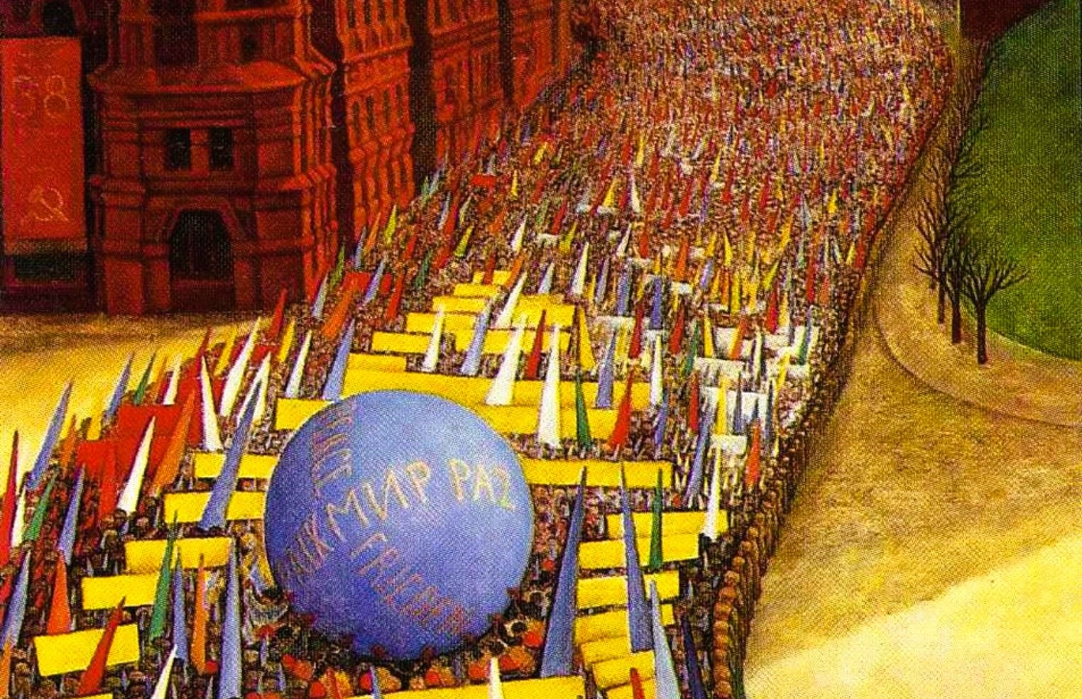 В эпоху оттепели (60-е годы) участвовать в шествии снова весело и важно, но энтузиазм в основном относится не к революционности или государственности, а к весне, молодости, надеждам и радости. А еще, как это ни покажется странным сейчас, — к солидарности с рабочими других стран в борьбе за мир, против всевозможной военщины.